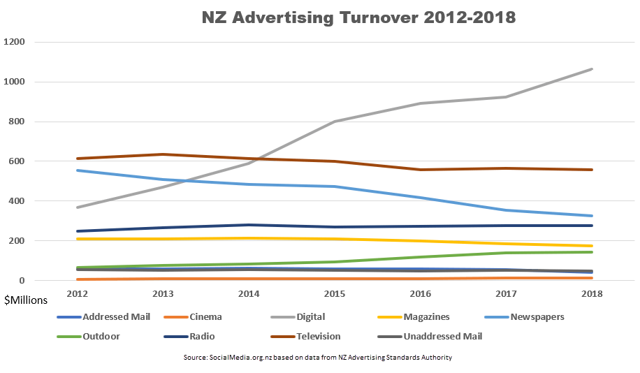 Where first Newspapers and then Television ruled the roost, now Digital Marketing dominates the NZ business environment (and has done so since 2015), attracting more dollars and more attention than any other.