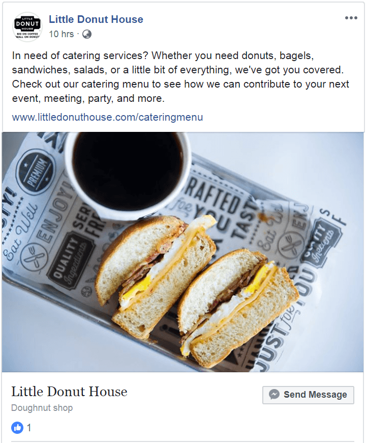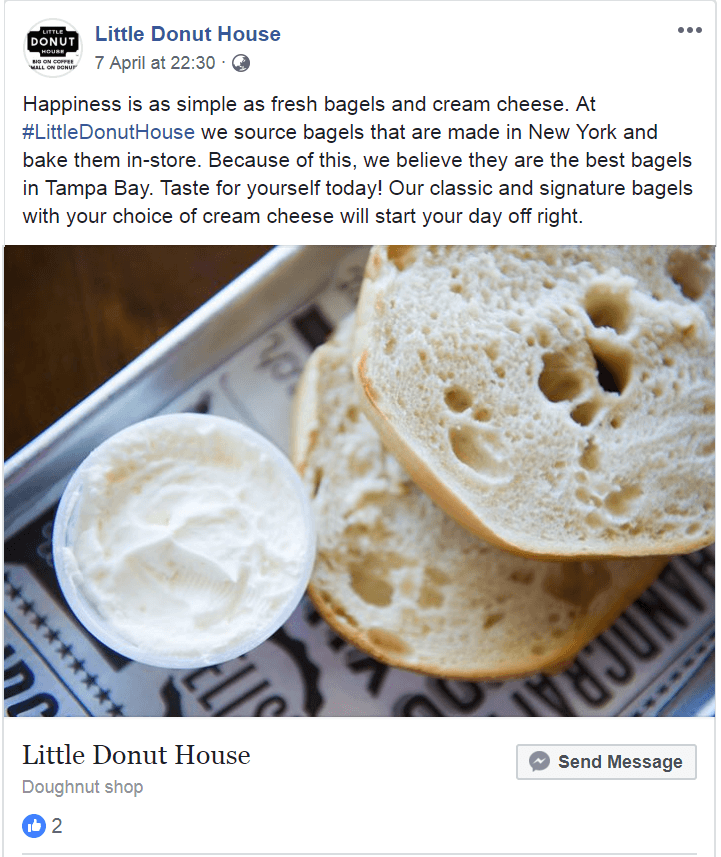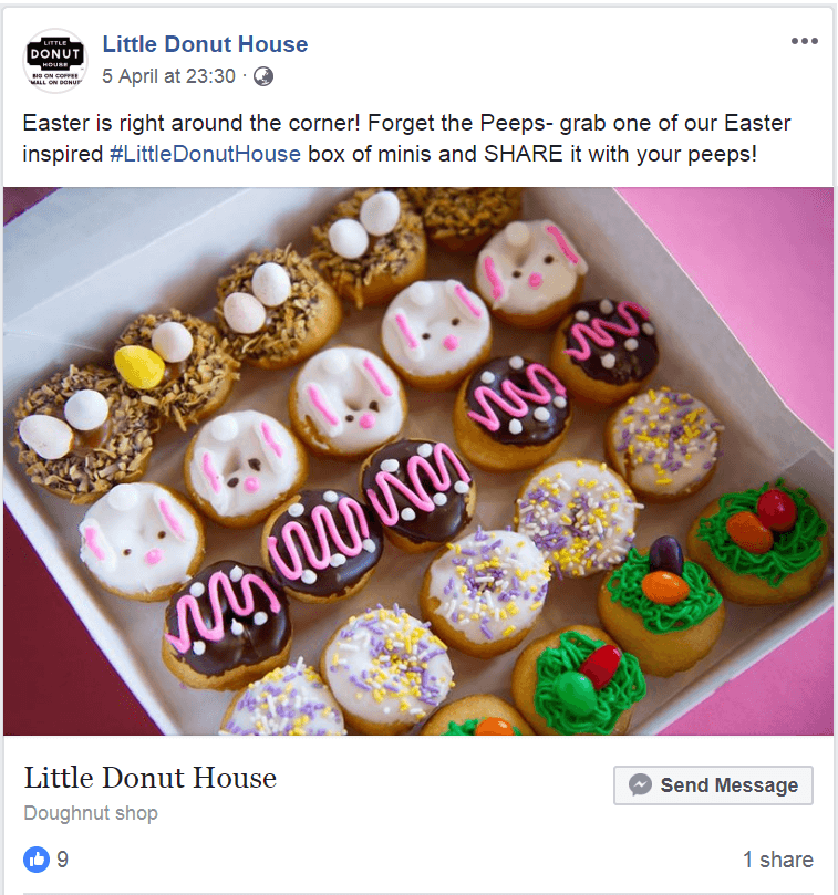 Only 10% of what you talk about in social media should be yourself and your own products or services. The rest of your discussions should be about things that matter to your followers. Don’t be like this Little Donut House shop, constantly posting meaningless pictures of donuts and drinks to an audience that couldn’t care less (3672 followers but just a handful of likes per image).