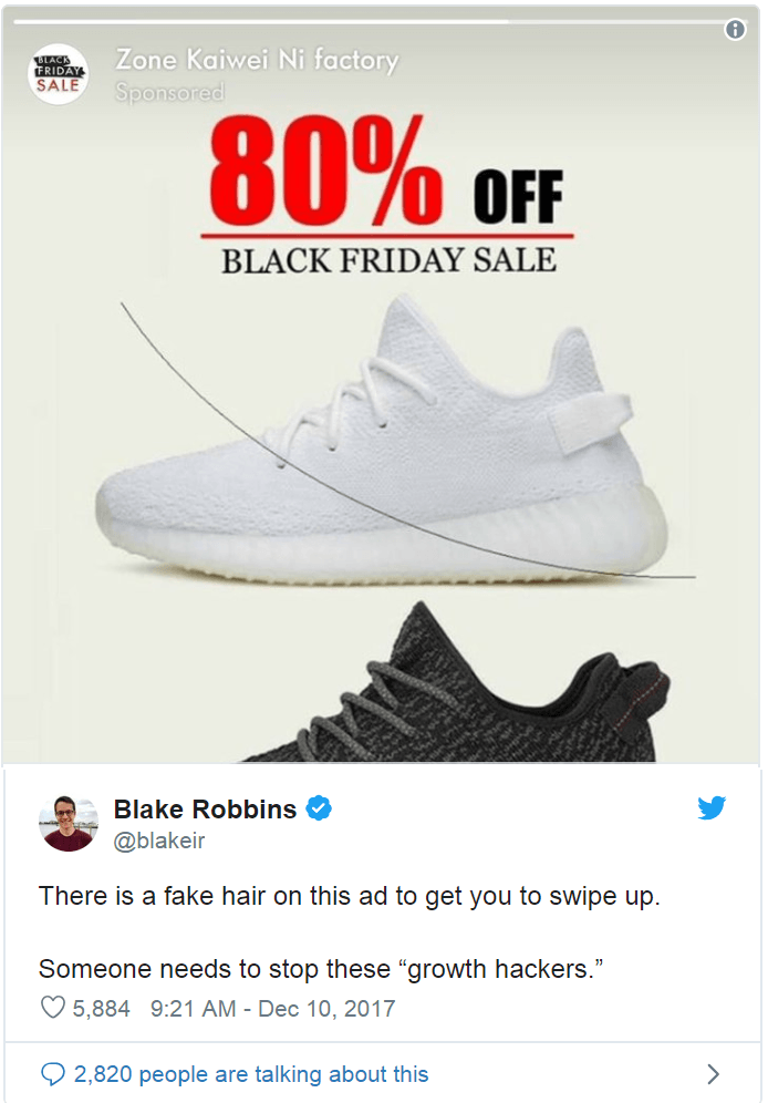 As Revive.social reports, Chinese sneaker manufacturer Kaiewei Ni published a Black Friday ad to Instagram Stories with a stray hair in the center. Whoever made the ad designed it to look as if there was a stray hair on the phone screen of the person viewing it.