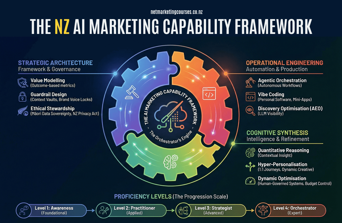 This course has been specifically engineered to align with the NZ AI Marketing Capability Framework. This objective benchmark ensures that your learning is not just about using tools, but about mastering the three pillars of modern marketing excellence: establishing a secure and ethical foundation (Strategic Architecture), building the autonomous systems that drive growth (Operational Engineering), and turning complex AI outputs into actionable wisdom (Cognitive Synthesis).
