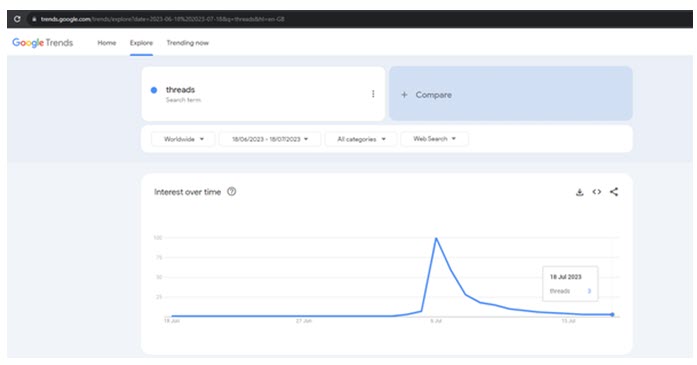 Unfortunately, by September 2023, interest in Threads had declined precipitously, dropping to just 3% of its peak.